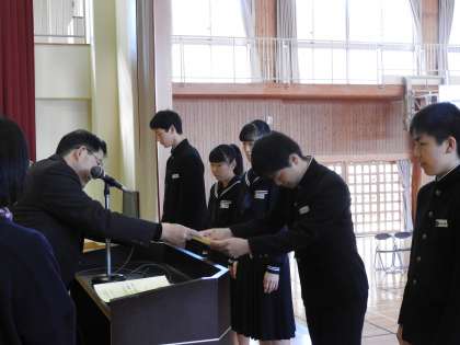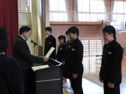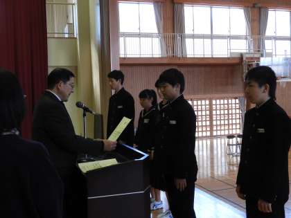 3年生の卒業式練習の前に表彰を行いました。沼津文園掲載の表彰です。全校集会がないため、学年の練習で表彰しました。
