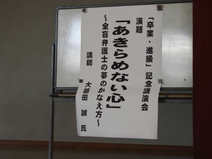 本日、5,6時間目は、卒業・進級記念講演会を開催しました。「あきらめない心か〜全盲弁護士の夢の叶え方〜」という演題でお話をしていただきました。体育館には400人の生徒と、一般の方々も参観に来てくださいました。