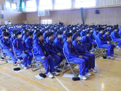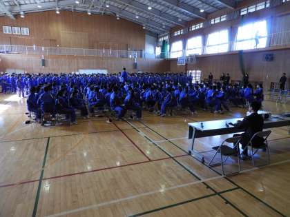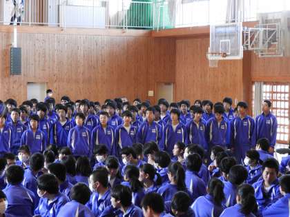 先生が8年ほど前にテレビに出演された映像を見せていただきました。著作権等の関係があるので、映像の写真は掲載しませんが、生徒たちは食い入るように映像を見ていました。人から信用されるのは、自分が相手を信頼することが大事。人生の岐路に立って迷ったときは、自分の心が温かくなる方を選ぶ。夢や目標を目指しているとき、もうだめだと思ったときが頂上の目の前なのだ、あきらめないことが物事を成し遂げる鍵だ、とお話を結ばれました。最後に大胡田先生に歌のプレゼントをしました。1、2年生からです。