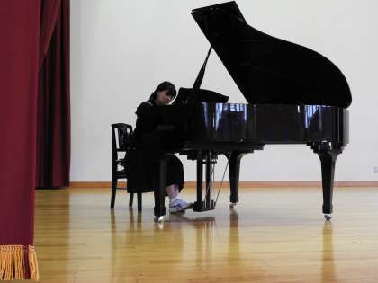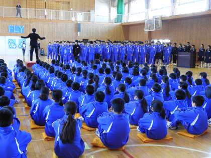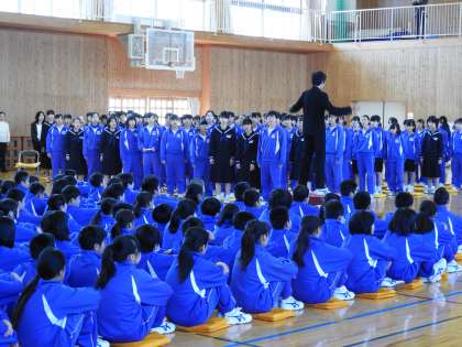 2,3年生による校歌斉唱です。1年生はしっかりとした姿勢で聴いています。