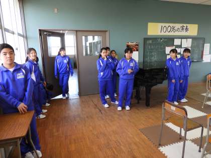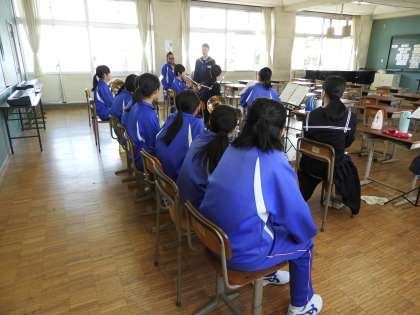 部活働見学(1年生)吹奏楽部です。1年生はちょっと緊張気味です。上級生が吹き方などを教えてくれていました。