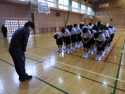 授業風景(1年 体育)です。集会があったため、ちょっと集合が遅れました。先生から時間配分の説明を聞いています。