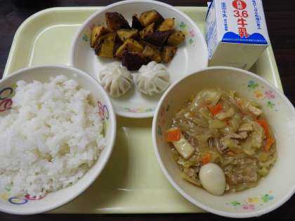 ご飯、牛乳、中華丼、ポーク包子、大学芋でした。