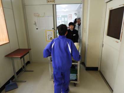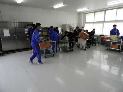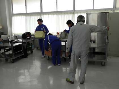 給食委員会の活動です。給食当番が配膳室へ食器等の片付けを運んでくる前に、集まって片付けを運営しています。