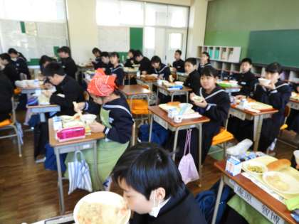 今日は、午前中、校長会で学校への戻りが遅くなったため、検食ができませんでした。1年A組にお邪魔して、会食してもらいました。インフルエンザで1人欠席があったため、グループを作っての給食は今日からやめていました。少しお話をできて楽しかったです。
