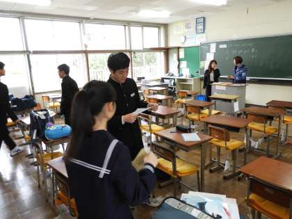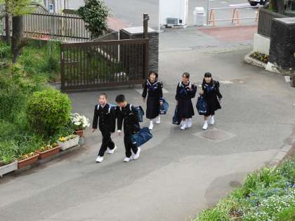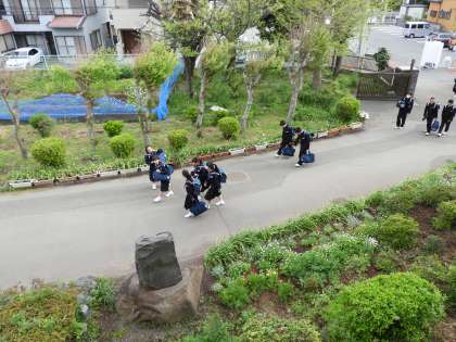 3年生の廊下から、生徒たちの登校が見えましたので、撮影しました。気づいた生徒があいさつをしてくれました。
