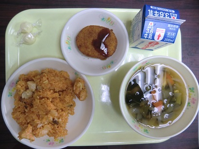 チキンライス、うずらたまごとやさいのスープ、だいずコロッケ、チーズ、牛乳 です。