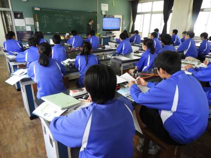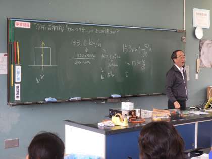 授業風景(3年D組 理科)です。演習問題の答え合わせをしながら、彰二先生の修学旅行にまつわる話をしっかりと聞いている3年生たちでした。