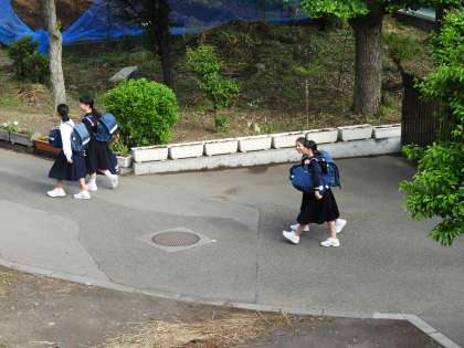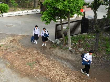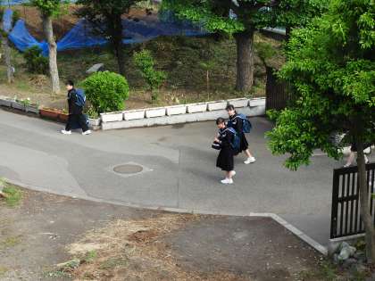 今日は、教室を回っていたので、3年生の2階の廊下から、生徒たちにあいさつしました。見上げて、あいさつを返してくれました。