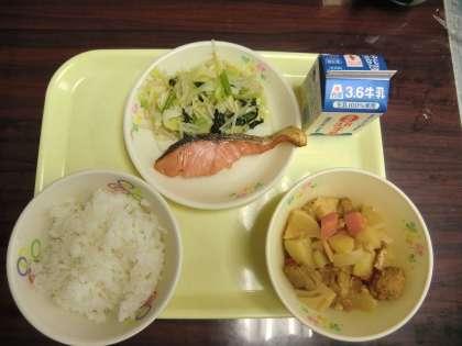 ご飯、牛乳、焼き塩鮭、野菜炒め、鶏肉と生揚げの煮物でした。
