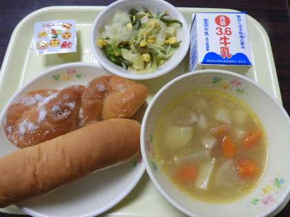 揚げパン、米粉入りパン、牛乳、ポトフ、茎わかめのサラダ、チーズでした。