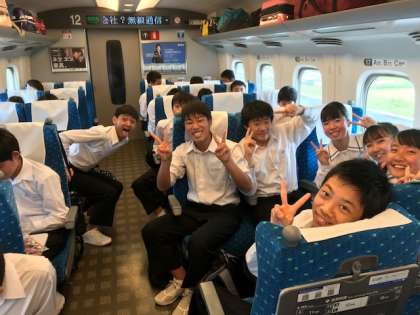 新幹線の中でトランプやウノを楽しむ生徒たちです。一般客と一緒の生徒たちは静かにしています。
