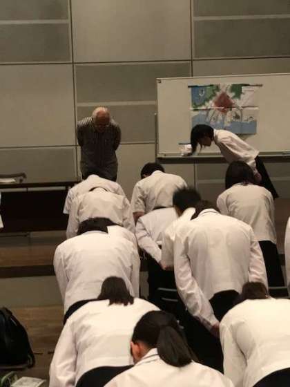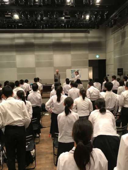 大越さんの体験や核についての貴重なお話を伺いました。代表生徒の挨拶後、全員でお礼の挨拶をしました。
