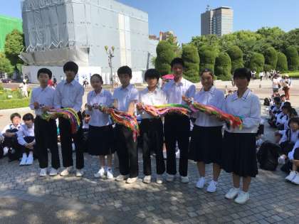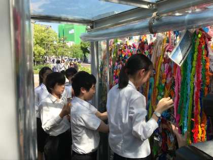 平和セレモニーでは、コスモスを歌い、詩の朗読、平和宣言を行ってきました。続いて、千羽鶴の奉納を行いました。