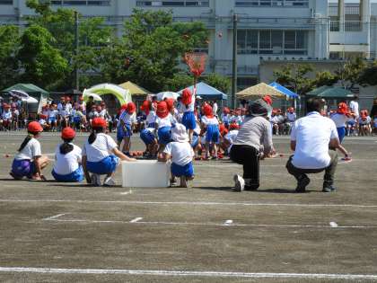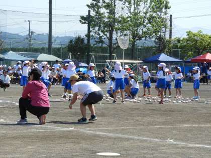 徒競走や瀬渡りなどの後、1年生の玉入れがありましたが、大接戦でした。会場からは温かい声援が送られていました。