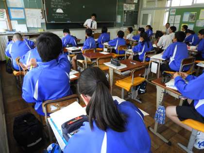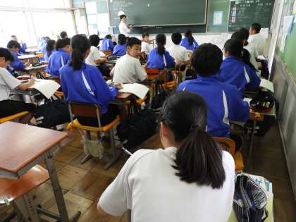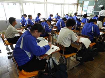 授業風景(2年C組 数学)です。教育実習生の先生が授業をやっていました。演習や弧について勉強中です。みんな静かに聴いています。