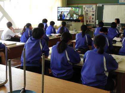 授業風景(2年A組 家庭科)です。2Aは家庭科室にいました。かしこい消費生活の映像を見ていました。