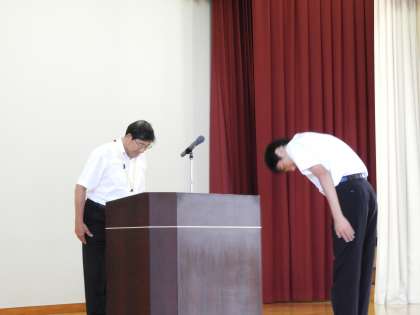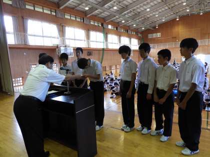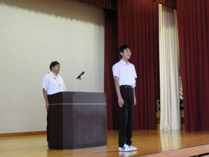 6月の朝礼です。会長の号令であいさつを交わした後、部活動等の表彰をしました。男子テニス部が市内大会団体3位になりました。