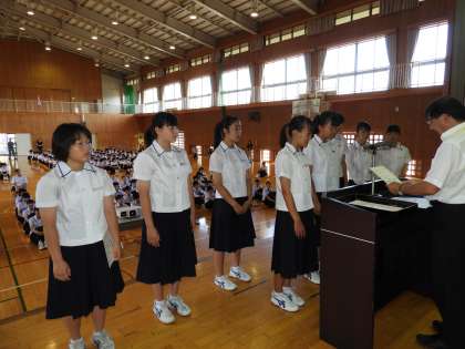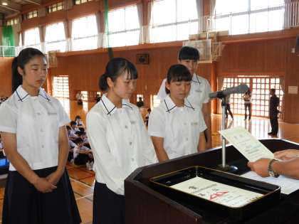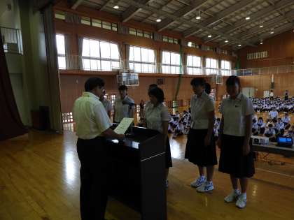 続いて、女子テニス部の表彰です。市内大会団体で準優勝でした。個人戦は5位に2つのペアが入りました。