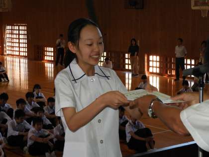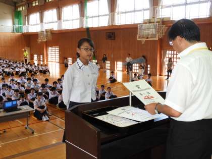 最後に6月の陸上競技東部中体連大会で、中1女子100mで優勝、共通幅跳び6位に入賞した中1女子と、市民卓球大会の個人戦で、5位、9位に入賞した中3女子を表彰しました。おめでとうございました。今後の原中生の活躍に期待しています。