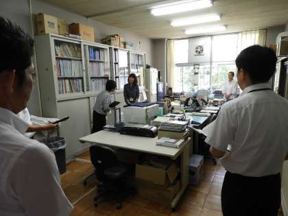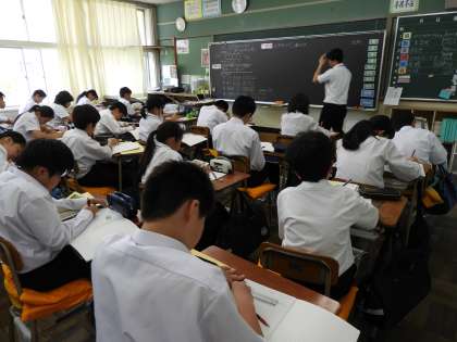 2時間目の終わりの時間帯です。1年数学、3年体育、最後に事務室を回りました。