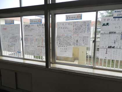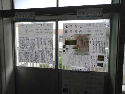 修学旅行グループ別研究新聞は、学級男女関係なく、テーマ別で研究を進めてまとめた物です。タクシーの運転手さんの力もお借りしながらチームの連携も取れていたと思います。