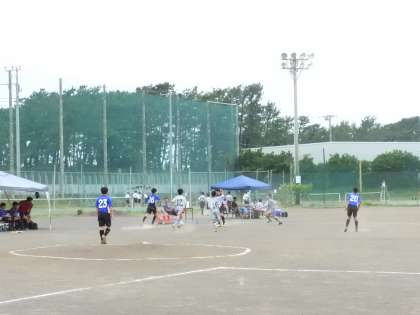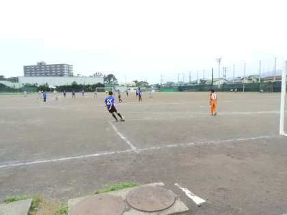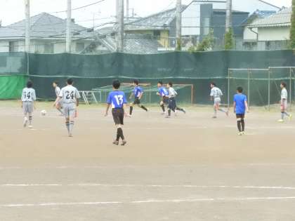土曜日の部活動(サッカー部)です。富士岡中学校が来てくれて、練習試合をやっています。この試合はBチームの対戦です。1年生も出ています。青いユニフォームが原中学校です。