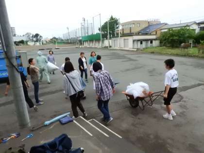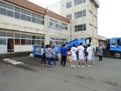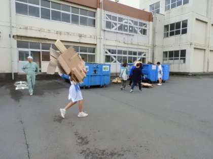 6月23日、古紙回収、始まりました!前年度にはじめたPTA古紙回収から、4ヶ月。少しずつ集めてきた古紙を業者にお願いして回収してもらいます。生徒たちの力も借りて積み込みます。