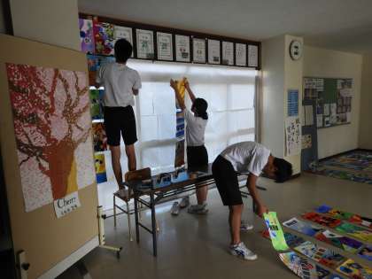 4時間で授業を終えて、掃除、帰りの会のあと、明日からの学校祭の準備が始まりました。体育の部の準備は順調に進んでいました。展示会場へ向かいました。