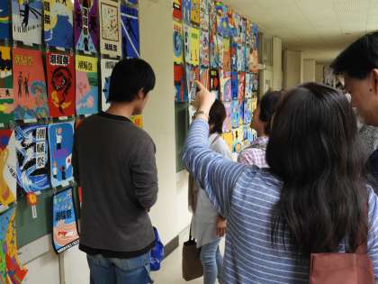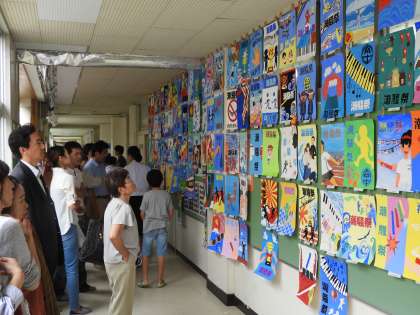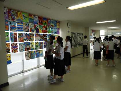 潮騒祭文化の部 昼休みの展示会場の様子です。潮騒ポスターには、すばらしい者が多く、先生賞をあげたい作品がたくさんありました。