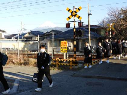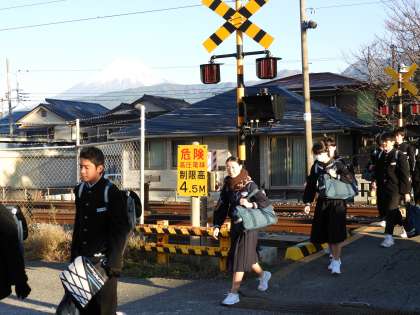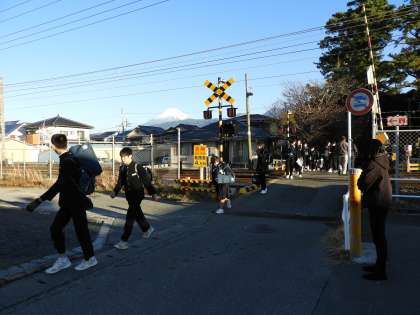 富士山をバックに、登校する生徒を撮影しました。