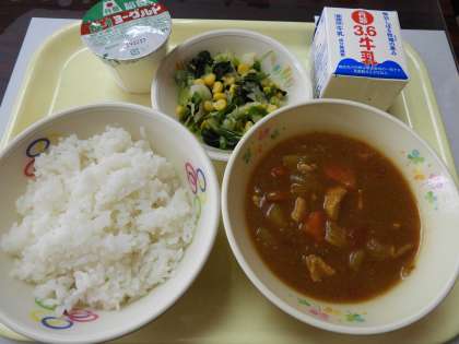 ご飯、牛乳、トマトチキンカレー、ほうれん草とコーンのソテー、ヨーグルトでした。