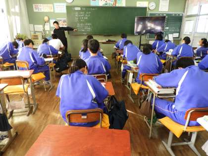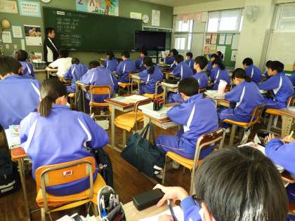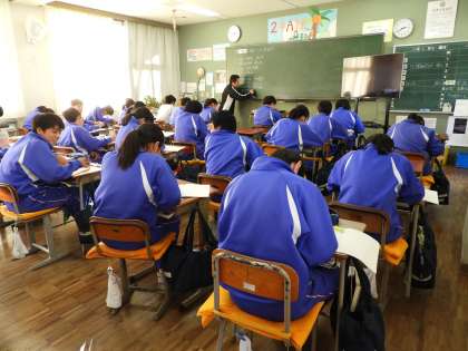 授業風景(2年A組 社会)です。京都地方の学習をしていました。修学旅行で訪ねる問いtです。ぜひ、原地区の学習と接点を見つけていってほしいと思います。
