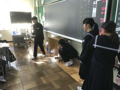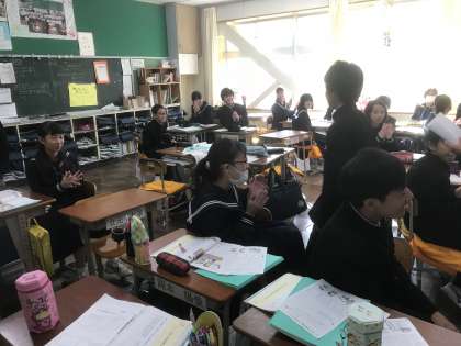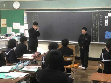ローテーション道徳(1年D組)です。1年A組の加藤先生が道徳をやっていました。ロールプレイで困っている人を助けるケースを演じていますが、熱演で盛り上がっています。