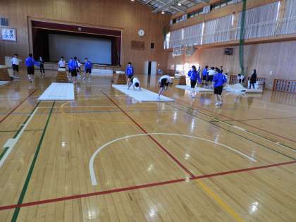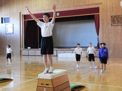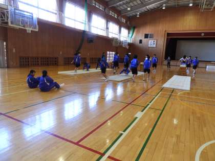 準備運動、男子は活発に動いていました。運動が苦手な生徒や跳び箱が怖い生徒が、動運動に向かい合うかが課題です。