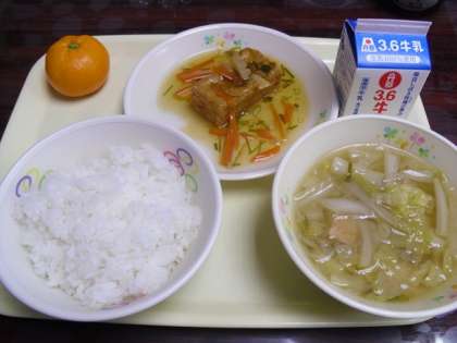 ご飯、牛乳、揚げ出し豆腐の野菜あんかけ、石狩汁、みかんでした。