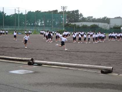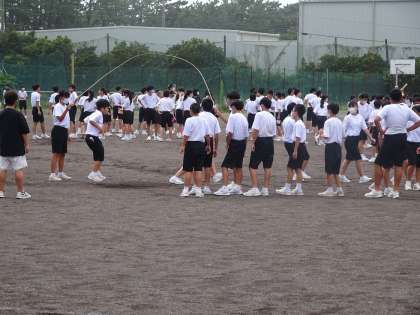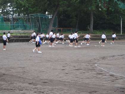 割り当てられた時間と場所で、学級ごとに潮騒祭に向けた練習を進めています。昼休みのグランドでは、1年生が8の字跳びに、2・3年生がリレー練習に励んでいました。