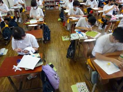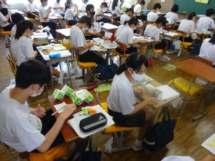 3年生の技術・家庭では、保育領域の学習で「乳幼児が喜ぶおもちゃをつくろう」をテーマに、各自が考えた作品に仕上げるために、フェルト、牛乳パック、ペットボトルなどの材料を用意して制作に取りかかりました。