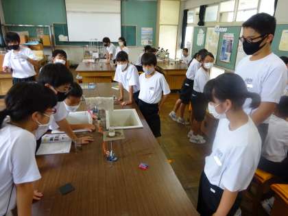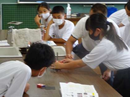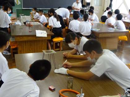 1年生の理科では、ビーカーに入れたロウをガズバーナーの火で溶かす実験をしました。実験では、ロウの質量と体積を溶かす前後、再度固まった時で比較して、状態変化と質量の関係について学習しました。