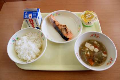 今日の給食は、「ご飯」「鮭のゴマ味噌マヨネーズ」「のっぺい汁」「梨のゼリー」「牛乳」です。