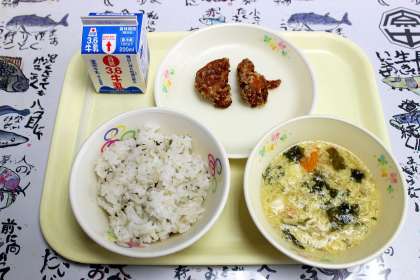 今日の給食は、「ご飯」「鶏肉の唐揚げ」「かき玉汁」「牛乳」です。