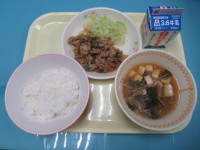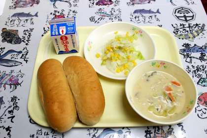 今日の給食は、「玄米入りパン」「サツマイモのシチュー」「こんにゃくサラダ」「牛乳」です。