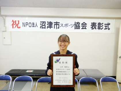 11/27(土)13:30より、「令和3年度沼津市スポーツ協会優秀選手賞表彰式」が沼津市民体育館にて行われました。本校からは、小針さんが陸上競技において「優秀選手」に選ばれ、表彰されました。社会人も含め、9名中のうちの1名ですので、大変名誉なことです。おめでとうございます!