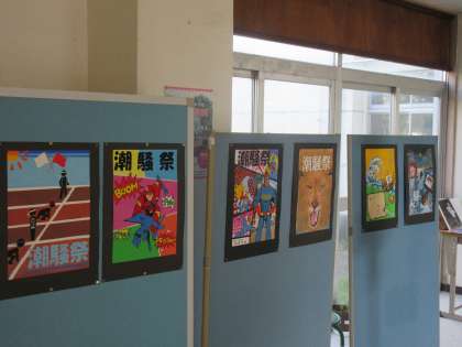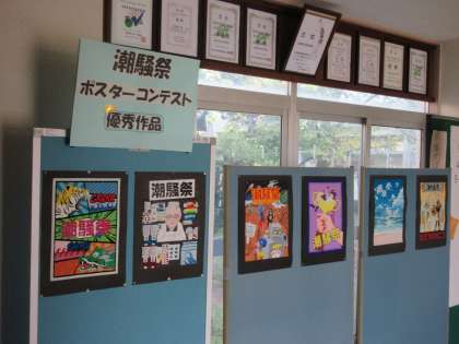 学校だより「潮騒」でもお知らせしました潮騒祭ポスターコンテスト優秀作品が、生徒玄関に掲示されています。