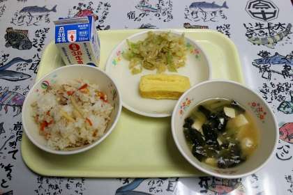 今日の給食は、「五目炊き込みご飯」「玉子焼き」「ゴマ入りおひたし」「ジャガイモの味噌汁」「牛乳」です。「五目」の意味は、具が5種類というわけではなく、いろいろ混ぜてあるということだそうです。