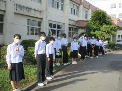 今朝も秋らしいさわやかな朝です。あいさつ運動頑張っています。