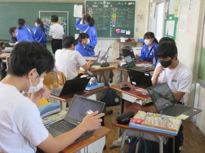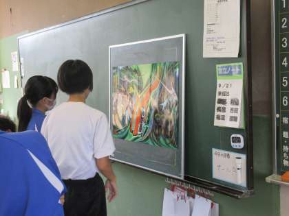3年美術では、岡本太郎の「森の掟」を鑑賞しています。作品の形や色、表現方法などからどのようなメッセージがあるのか、考えました。