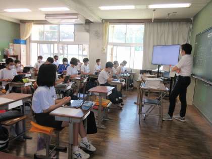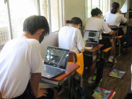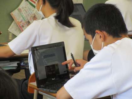 2年社会は「江戸時代の文化」の学習です。Chromebookを使って8分間テストをしているところでした。問題を読み取っています。