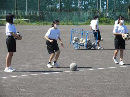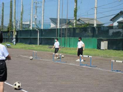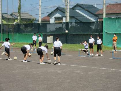 2年保体はサッカーです。ハードルをゴールに見立て、ボールをまっすぐに蹴る練習です。