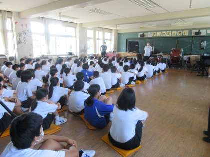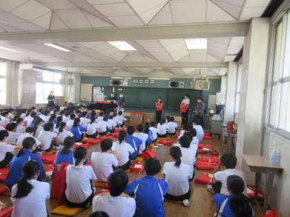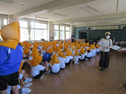 「押さない!走らない!しゃべらない!」が徹底され、素早く、緊張感をもって避難訓練ができました。避難ライフジャケットが配られ、装着するところまでが訓練です。日ごろから備えていきましょう。